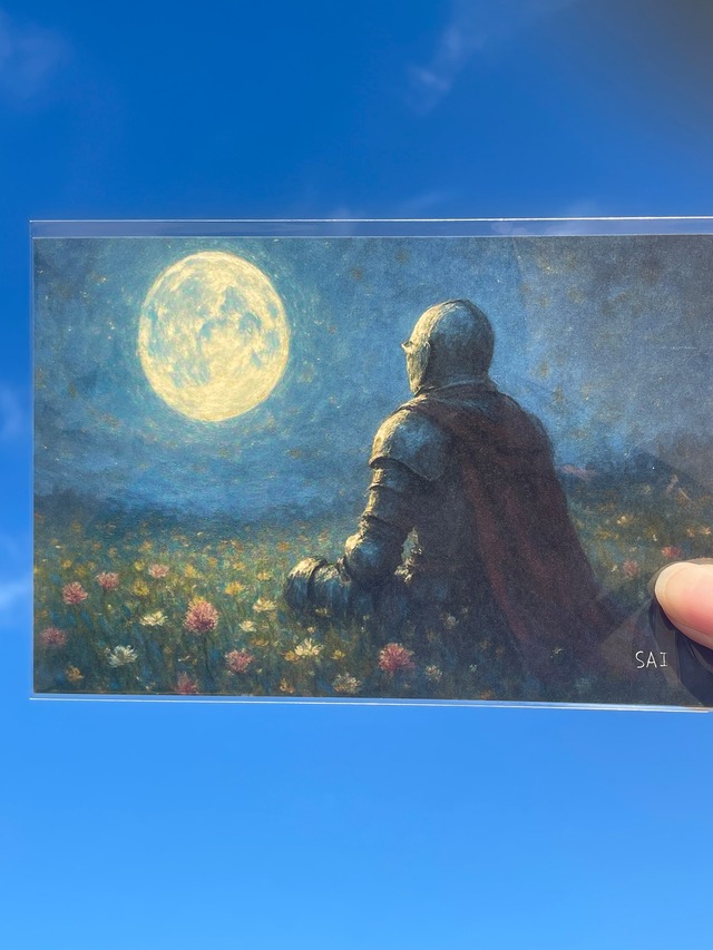 【平和の時間を、騎士のポストカード】 戦いが終わり、鎧の重みだけが静かに残る夜。 騎士は花咲く野に腰を下ろし、月を見上げる。 剣を振るうことも、命を賭けることもない夜に、 初めて訪れた“心の静寂”。 誰かを想っているのか、 あるいは、自らの過去に思いを馳せているのか。 何も語らないその背中には 何が見えるだろう。 彼の目には何が映ってくるのだろう。 このポストカードは、 過ぎ去った時間と、そこに確かにあった想いを そっとすくい上げるような1枚。 飾るたび、手に取るたびに、 「終わり」の中にもある優しさや余韻を、 心に届けてくれることでしょう。 youtube公開中 https://youtu.be/D95LrPtcFSo?si=2NC0YlZhfAhtepbe - -*- - -*- - -*- - -*- - -*- - -*- -*- -*- - - やわらかな絵とことばが紡ぐ、小さな物語のポストカード。 壁に飾れば、日々の景色に青の静けさを。 フォトフレームに入れれば、部屋に物語を。 手帳にはさんで、ふとした時に開けば癒しの時間を。 ── 自分だけの静かな時間に。 そして大切な誰かへの贈り物にも。 ■ サイズ ・はがきサイズ(10.5cm×14.8cm) ■ 素材 ・純白の高級ケント紙 ■製造国 ・韓国 ■ お手入れ・取り扱い ・水濡れや直射日光を避けて保管してください。 ・表面を傷つけたり、強い摩擦を加えないようご注意ください。 ・1点ずつ透明パッケージに入れてお届けします。 ■ 発送について ・通常、ご注文から2日以内に発送いたします。 ・イベント出展時は、イベント終了後に順次発送となります。 ■ その他のご案内 ・本作のイラストはAI生成を用いて制作し、必要に応じて調整を加えています。 ・専門の印刷所にて仕上げておりますが、状況により用紙や仕様が変更となる場合がございます。 ・ご覧いただくモニター環境によっては、実物と色味が若干異なる場合がございます。 ・制作はすべて小ロットで行っているため、数量限定のご案内となります。 再販ができない場合もございますので、出会えるときに手に取っていただければ幸いです。 ■ お問い合わせ ご不明点はショップのお問い合わせページよりお気軽にどうぞ。 - -*- - -*- - -*- - -*- - -*- - -*- -*- -*- - - あなたの日常に、小さな希望とファンタジーを。