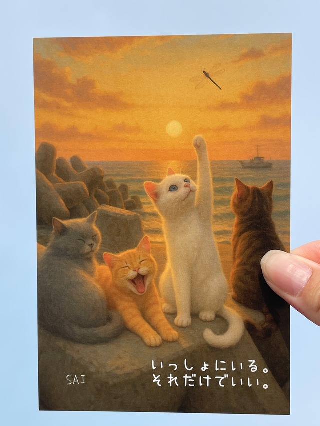 【夕焼けの穏やかな時間、いつもの光景ポストカード】 夕暮れの海辺で、4匹の猫たちが過ごすひととき。 寄り添い、あくびをし、とんぼを見つめながら、それぞれの時間を生きている。 そこには、言葉はいらない「しあわせ」がありました。 「いっしょにいる。それだけでいい。」 そう思える瞬間が、人生にはたしかにある。 特別なことが起こらなくても、大切な存在とただ同じ景色を見つめる—— そんな何気ない日々が、愛おしくて仕方ない。 “そばにいること”のあたたかさと、 何でもない平和な日常の尊さを、 そっとあなたへ・・・ - -*- - -*- - -*- - -*- - -*- - -*- -*- -*- - - やわらかな絵とことばが紡ぐ、小さな物語のポストカード。 壁に飾れば、日々の景色に青の静けさを。 フォトフレームに入れれば、部屋に物語を。 手帳にはさんで、ふとした時に開けば癒しの時間を。 ── 自分だけの静かな時間に。 そして大切な誰かへの贈り物にも。 ■ サイズ ・はがきサイズ(10.5cm×14.8cm) ■ 素材 ・純白の高級ケント紙 ■製造国 ・韓国 ■ お手入れ・取り扱い ・水濡れや直射日光を避けて保管してください。 ・表面を傷つけたり、強い摩擦を加えないようご注意ください。 ・1点ずつ透明パッケージに入れてお届けします。 ■ 発送について ・通常、ご注文から2日以内に発送いたします。 ・イベント出展時は、イベント終了後に順次発送となります。 ■ その他のご案内 ・本作のイラストはAI生成を用いて制作し、必要に応じて調整を加えています。 ・専門の印刷所にて仕上げておりますが、状況により用紙や仕様が変更となる場合がございます。 ・ご覧いただくモニター環境によっては、実物と色味が若干異なる場合がございます。 ・制作はすべて小ロットで行っているため、数量限定のご案内となります。 再販ができない場合もございますので、出会えるときに手に取っていただければ幸いです。 ■ お問い合わせ ご不明点はショップのお問い合わせページよりお気軽にどうぞ。 - -*- - -*- - -*- - -*- - -*- - -*- -*- -*- - - あなたの日常に、小さな希望とファンタジーを。