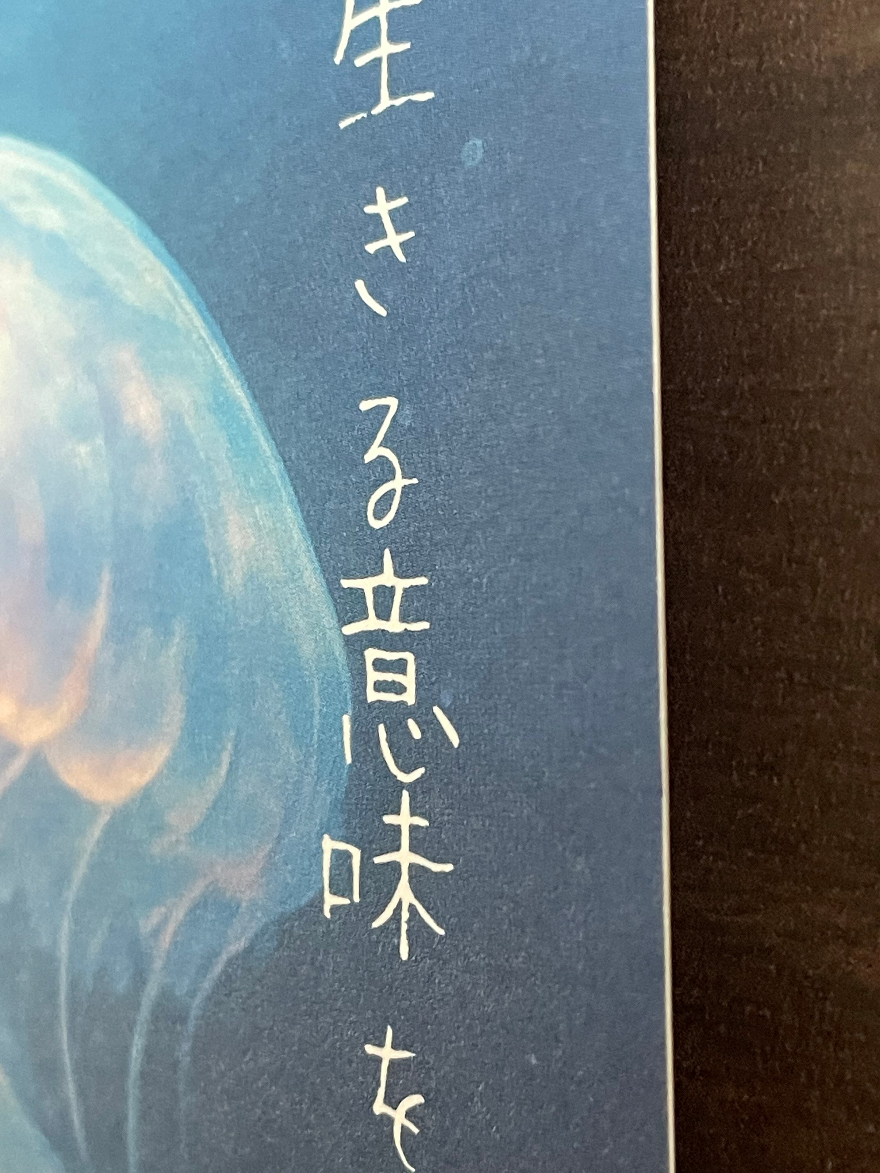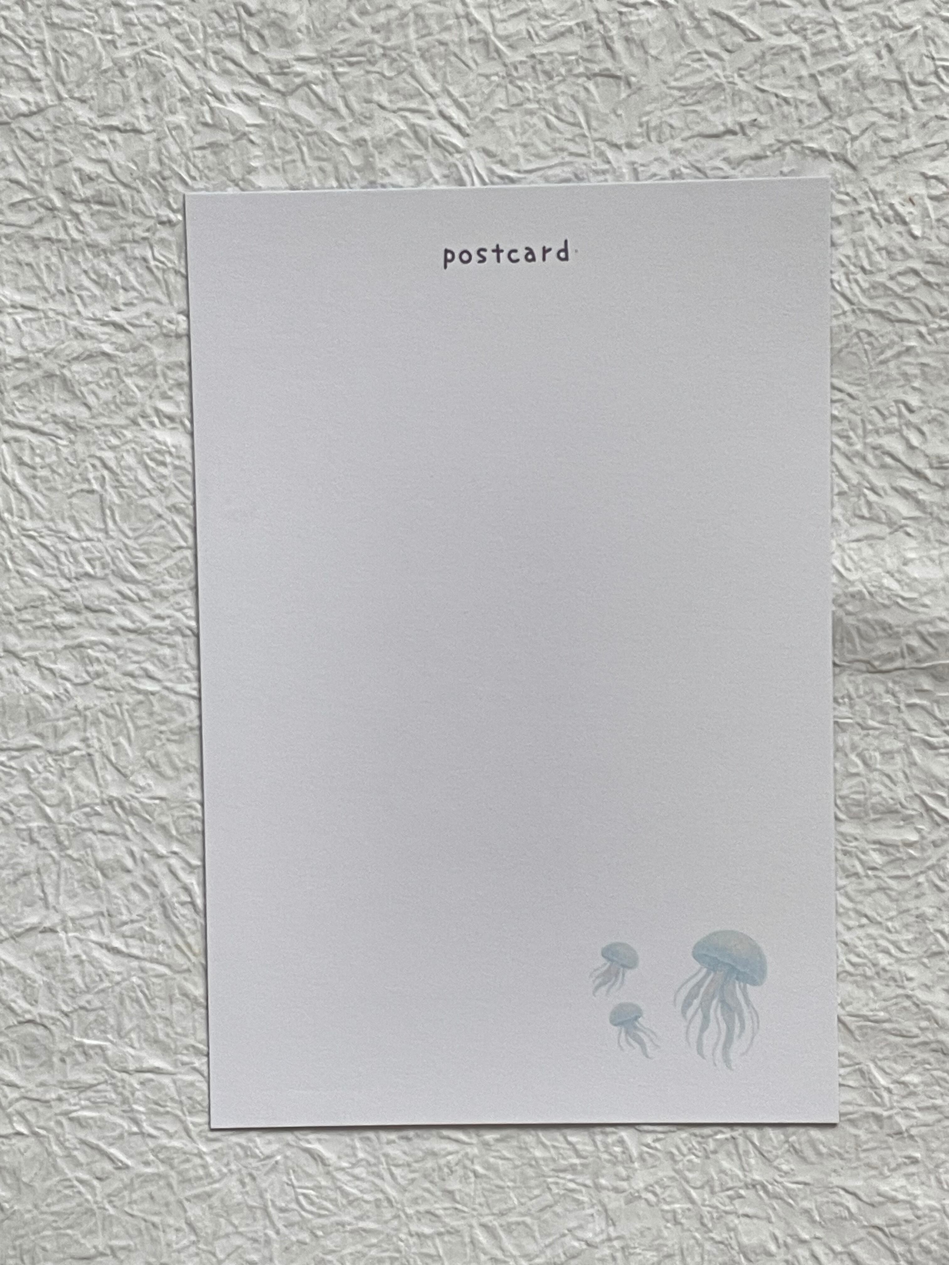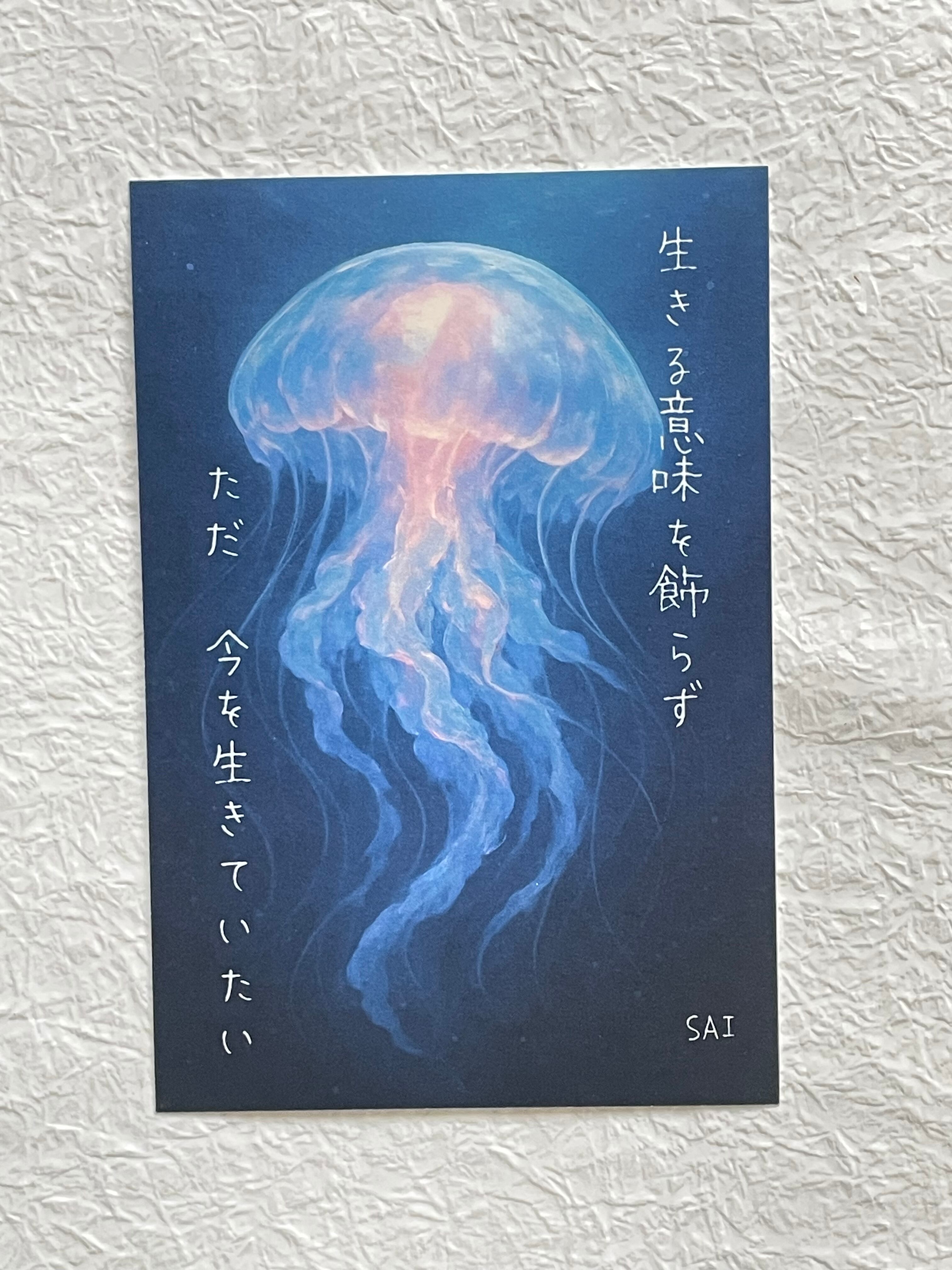 静かな海の底で、ゆらめくクラゲ(海月)の姿を描いたポストカードです。