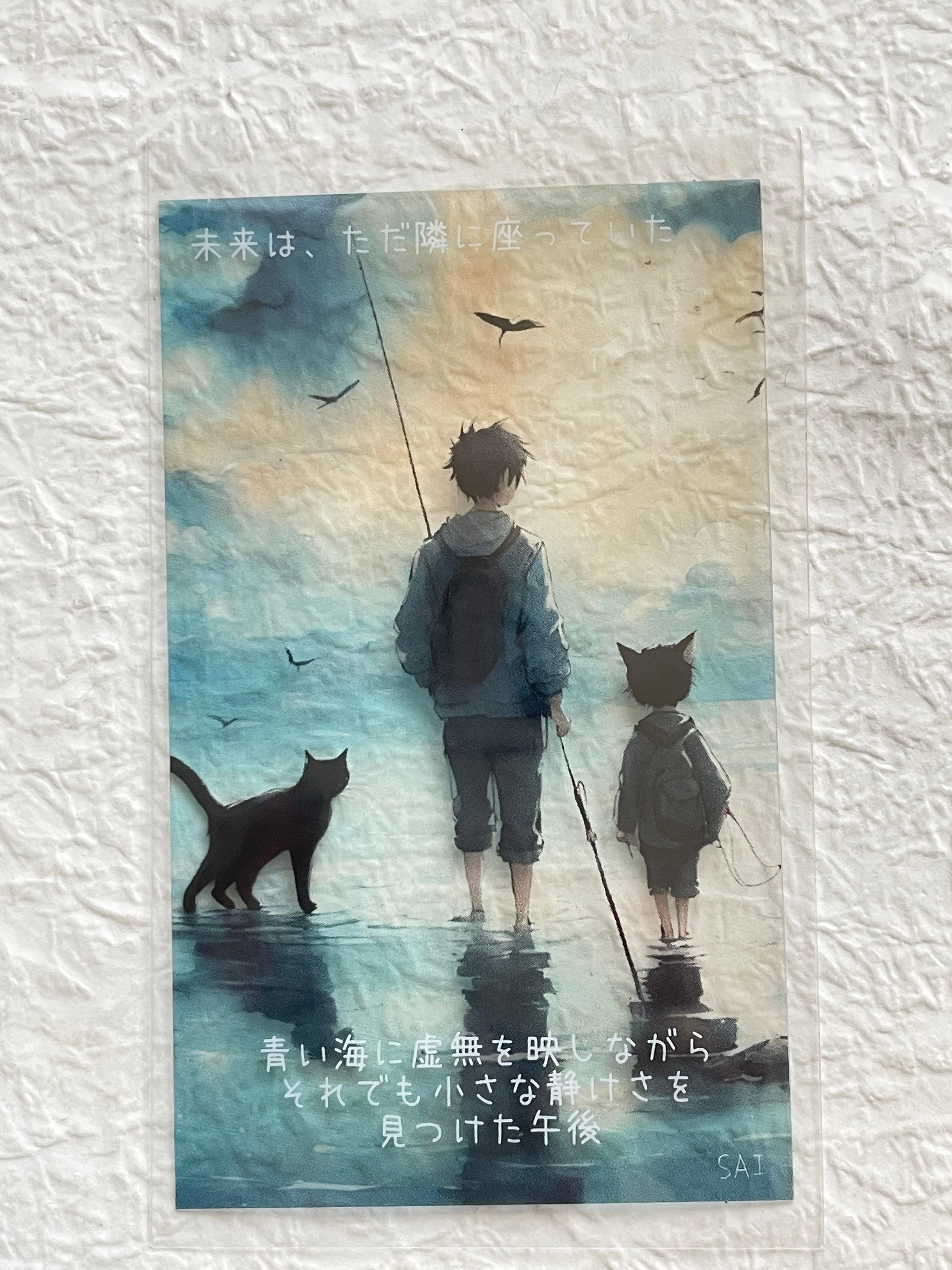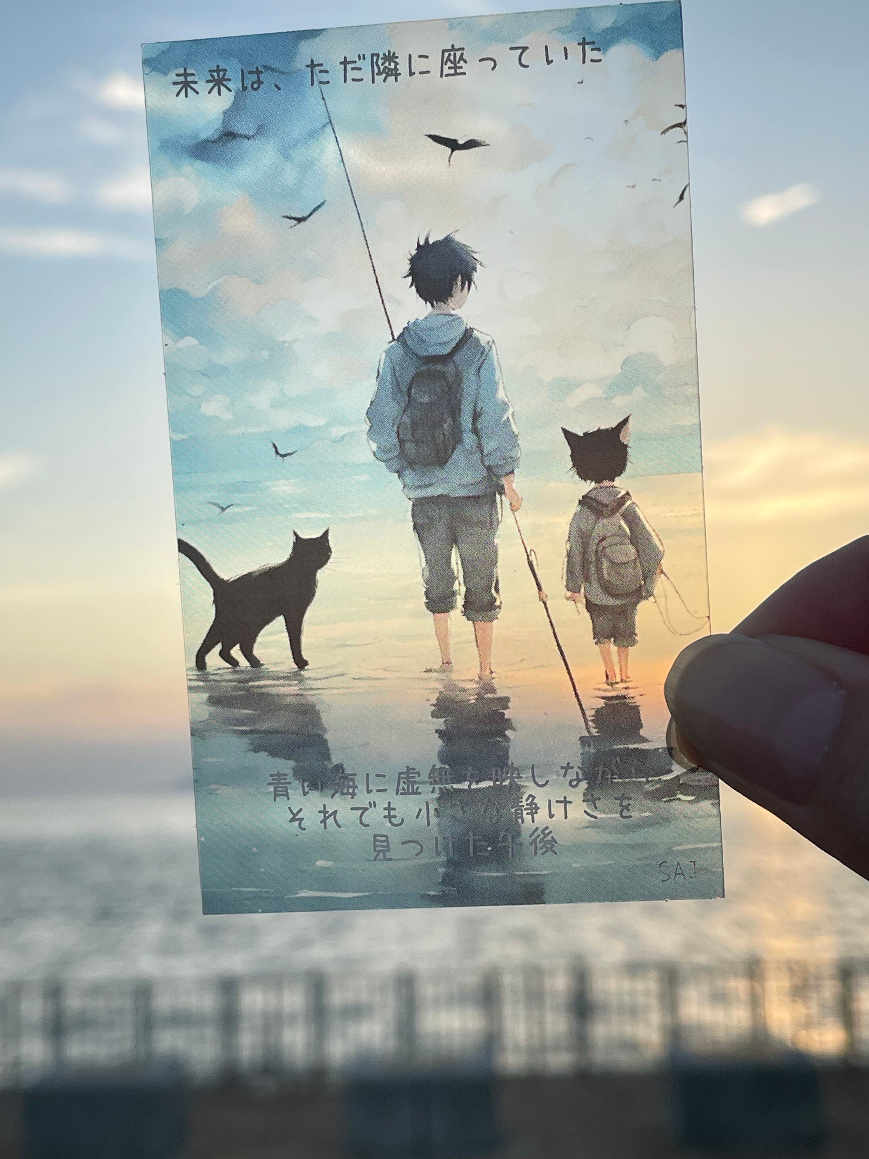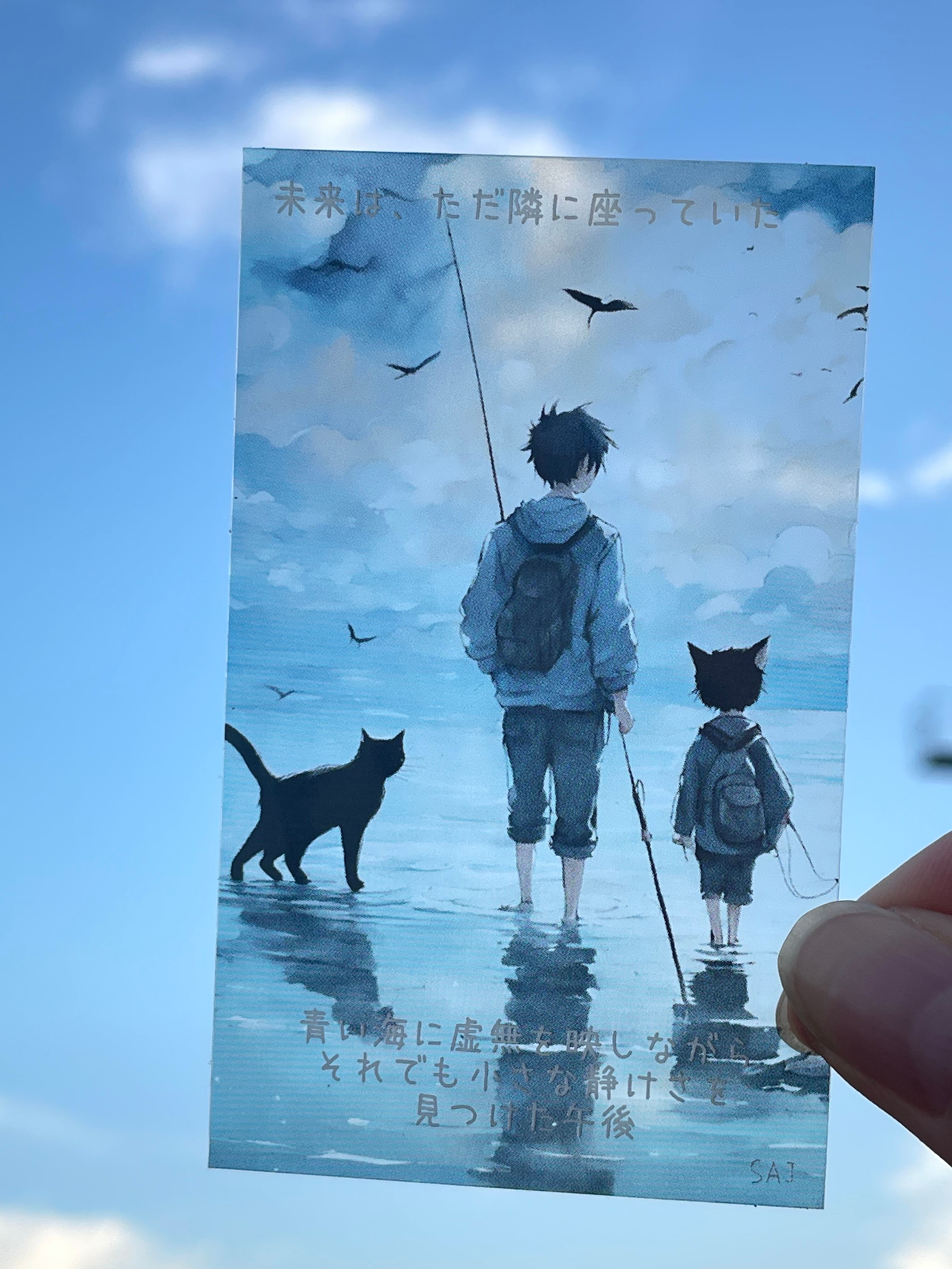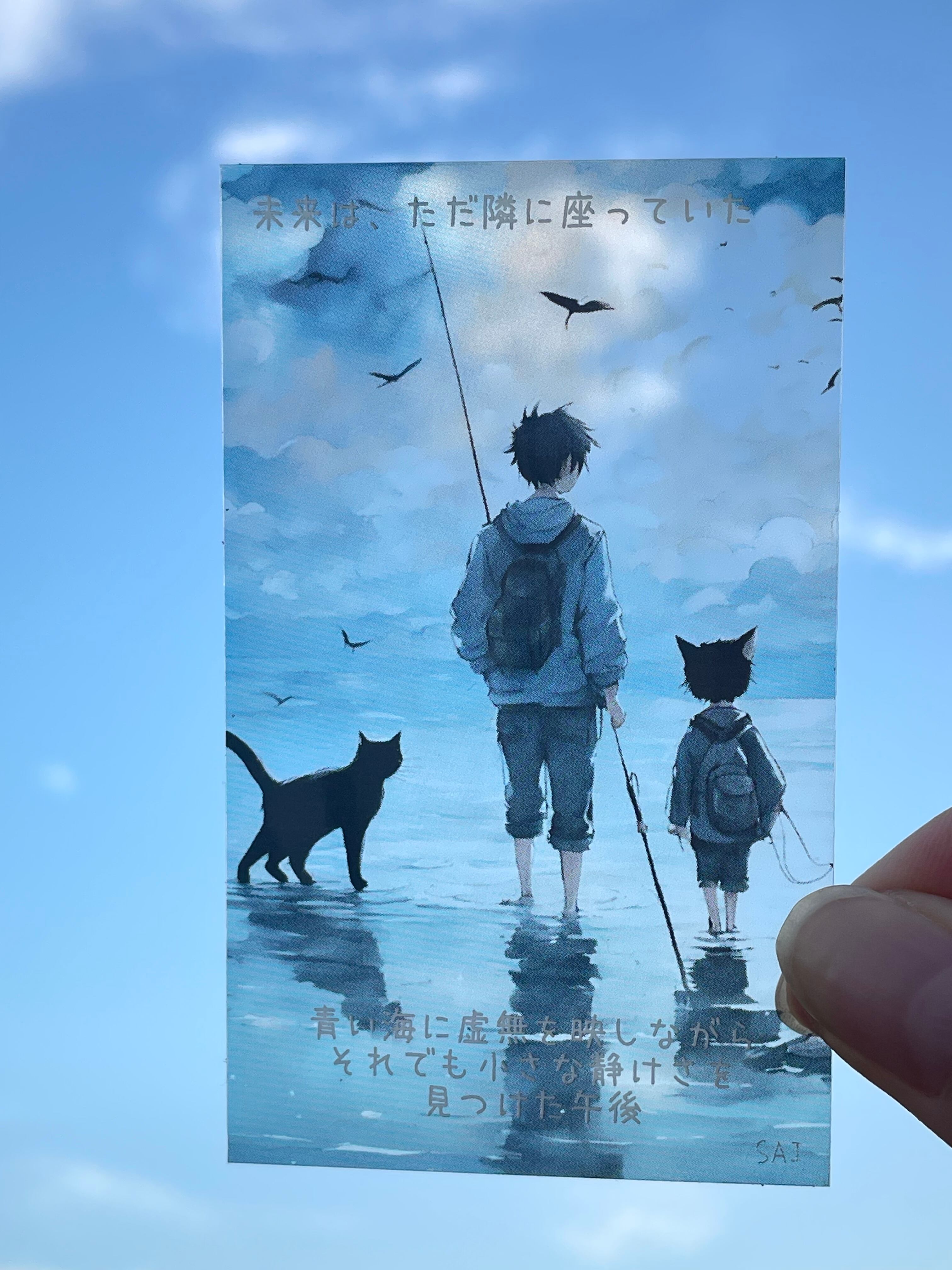 クリアカード 【虚無】 猫 海 釣り 自由 生きるとは 未来は、ただ隣に座っていた – 虚無の海と猫の午後