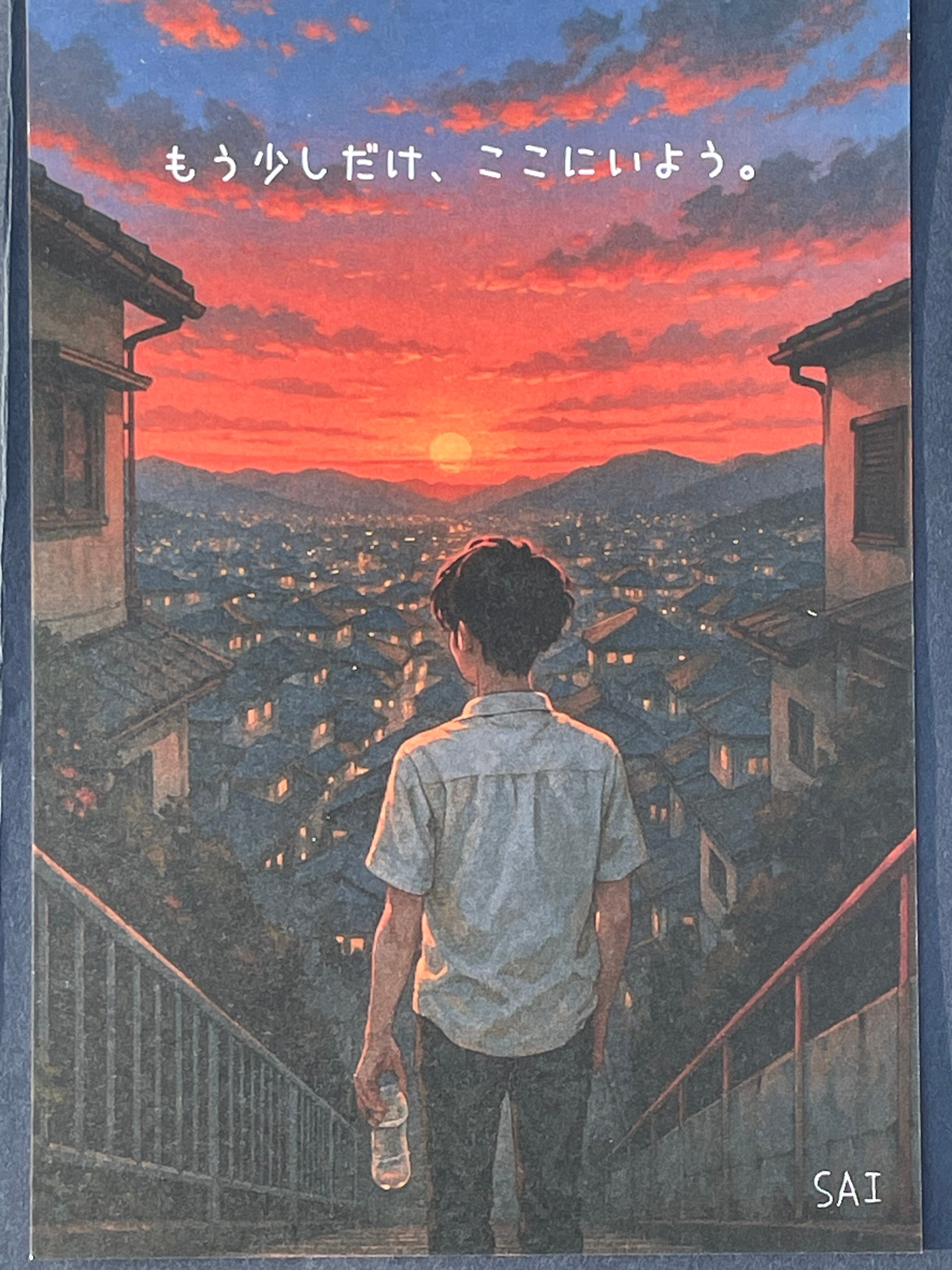 ポストカード 【ここから見る夕焼け】 夕日 夕焼け ペットボトル 一人の時間 刹那 思い出 階段 風景 もう少しだけ、ここにいよう。